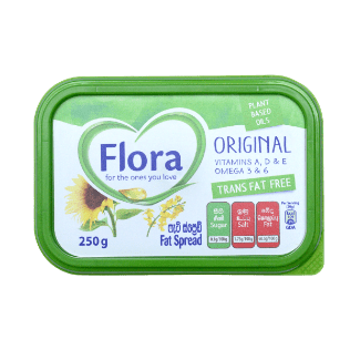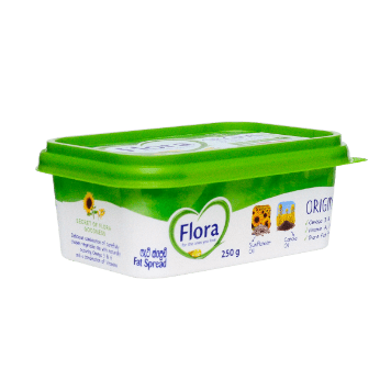 Flora is a delicious combination of carefully chosen plant-based oils which are cholesterol free, with naturally occurring omega 3 & 6 and a combination of vitamins (A, D & E). Flora delivers the same buttery taste but with 60% less saturated fat and free from trans fats unlike butter.